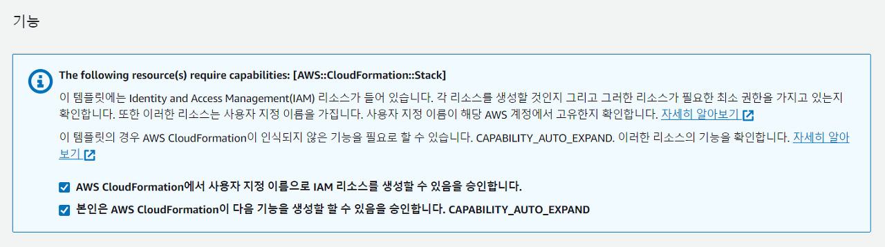 스택 이름 생성 후 모두 기본 옵션으로 두고 검토 단계에서 IAM 리소스 생성 확인 버튼을 체크합니다.