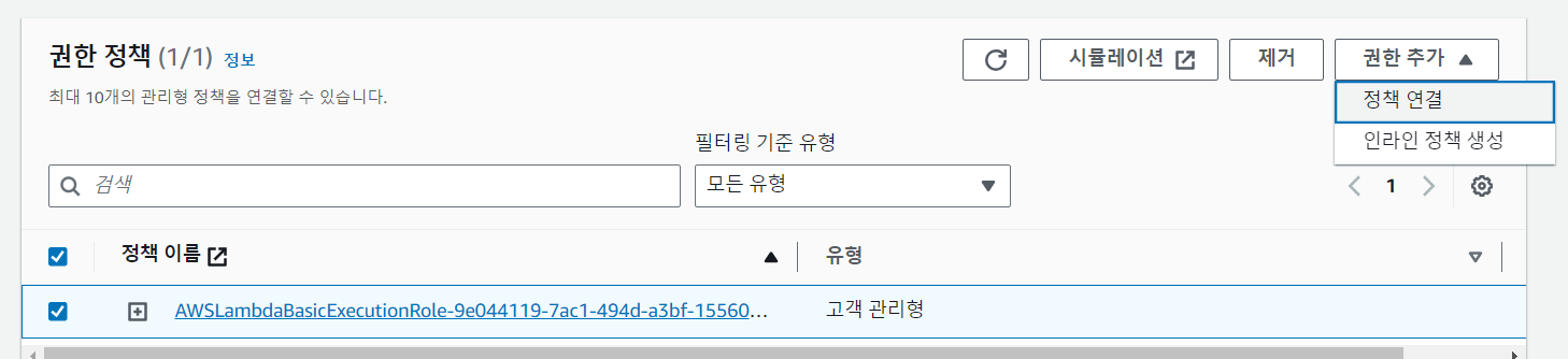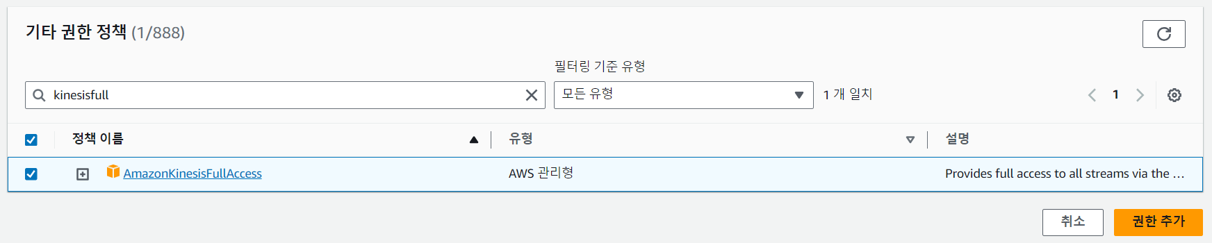 기존 역할에서 "IAM 콘솔에서 Lambda IAM 역할을 확인합니다"를 클릭한 뒤 AmazonKinesisFullAccess 권한을 추가하여 추후 Lambda가 Kinesis Data Firehose에 접근하여 데이터를 가져올 수 있도록 합니다.