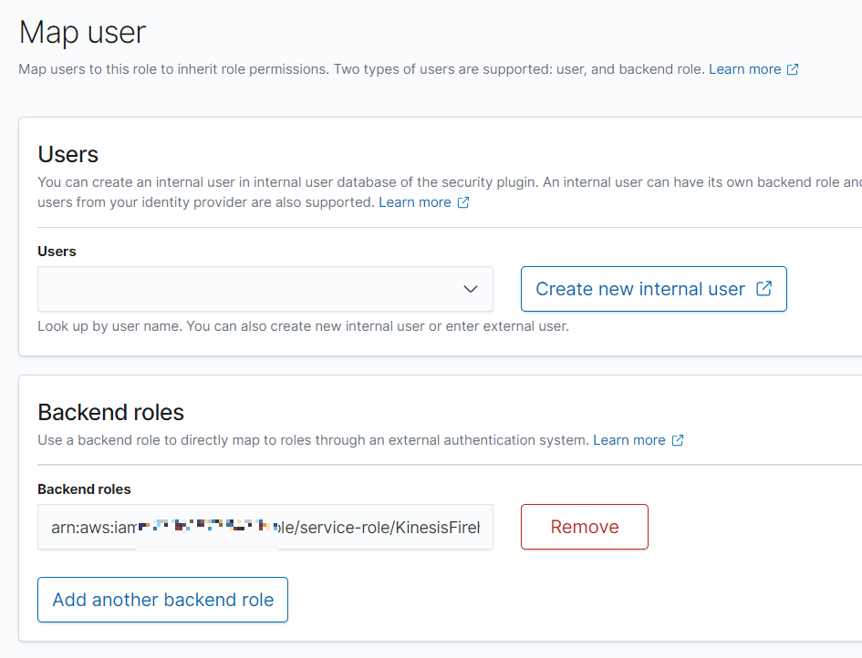 Map users > Backend roles에 Kinesis Data Firehose의 IAM ARN을 입력 후 Map 버튼을 클릭합니다.