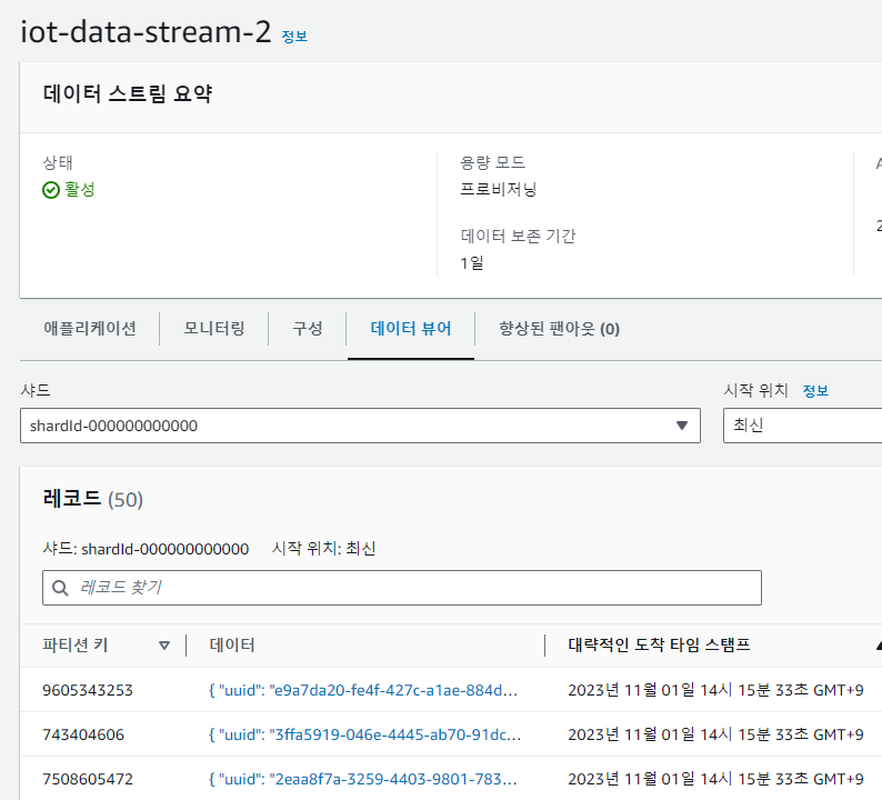 Kinesis Data Streams > 'iot-data-stream-2'로 이동합니다.