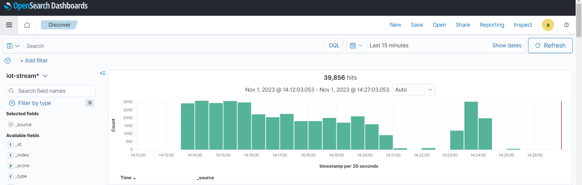 다시 Opensearch > Discover로 이동하여 데이터가 안정적으로 저장되고 있는지 확인합니다.