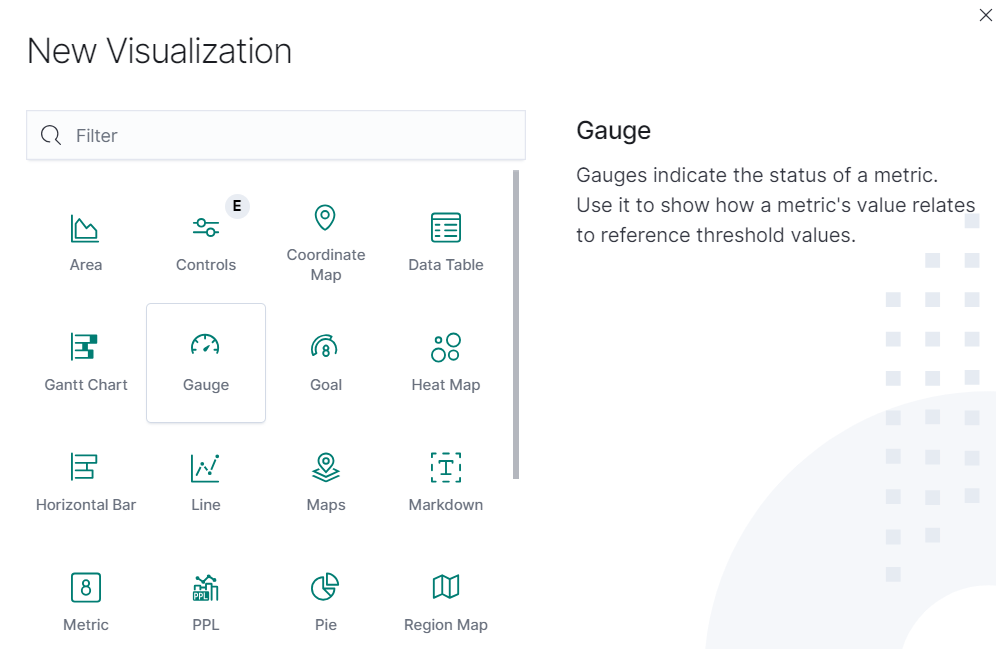 create new > 대시보드 생성화면에서 시각화 메뉴 중 게이지로 진행해보겠습니다.