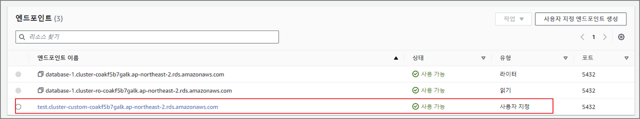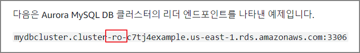 중요한건 이 엔드포인트가 유일하게 DDL 문 등의 쓰기 작업을 수행할 수 있는 유일한 엔드포인트라는 것인데요. 따라서 클러스터 엔드포인트는 처음 설정하는 경우, 클러스터 단일 DB 인스턴스만 있는경우 에 연결하는 엔드포인트 입니다.
