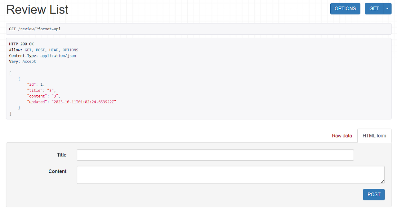 http://localhost:8000/review/ 를 들어가면 CRUD View를 확인할 수 있습니다.
