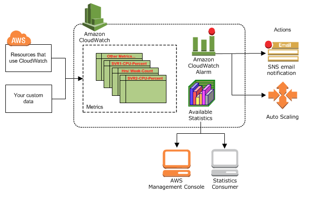 예를 들어 경보는 인스턴스 중지, auto scaling 및 Amazon SNS 작업 시작, 종료 등으로 구성할 수 있습니다.