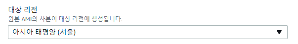 복사된 AMI 이미지에서 우측 마우스를 클릭하여 AMI 복사를 클릭합니다. 그리고 아래와 같이 대상 리전을 아시아 태평양 (서울)로 변경 후 AMI 복사를 수행 합니다. 그러면 소유자 등 정보가 공유 계정의 아이디 정보로 변경 됩니다.