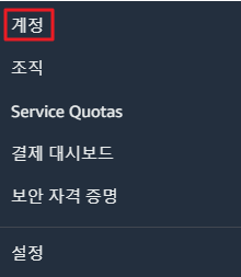 우측 상단에 AWS 계정을 클릭하면 아래와 같이 화면이 나옵다. 여기서 계정 정보를 확인할 수 있습니다.