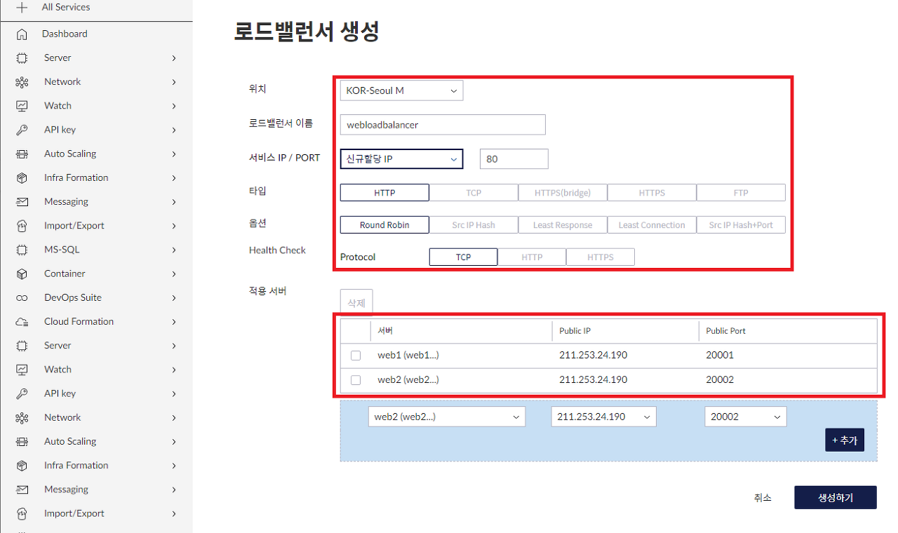 - - 서비스 IP / PORT: 로드밸런서의 서비스IP와 포트 (사용자가 웹 브라우저에 호출할 새로운 IP:port)를 선택합니다. 신규 IP할당인 경우 선택할 필요가 없습니다.(default) 포트는 HTTP이므로 80을 입력합니다.