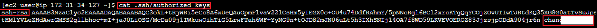 새로 생성한 Keypair를 이용하여 EC2를 새로 생성하고 해당 EC2에 접속한 후 키 공개 키 값을 확인한 후 복사한다.