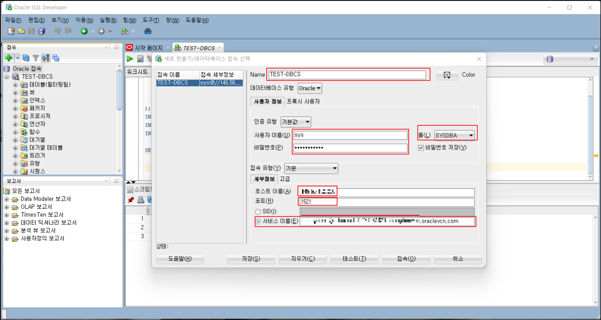 비밀번호 : 비밀번호의 경우도 위에서 sys의 비밀번호를 DB 생성하게 될 때 설정하신 비밀번호 입력