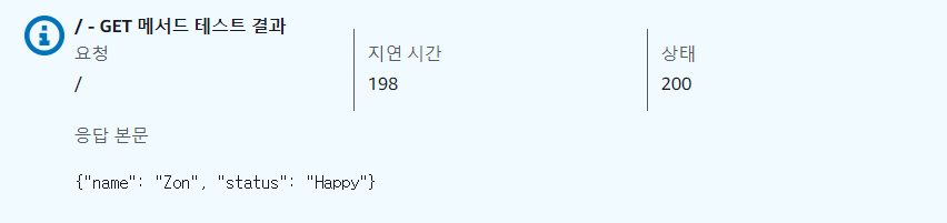 상태에 200, 이름과 상태가 표시된다면 성공적으로 테스트를 완료한 것입니다.