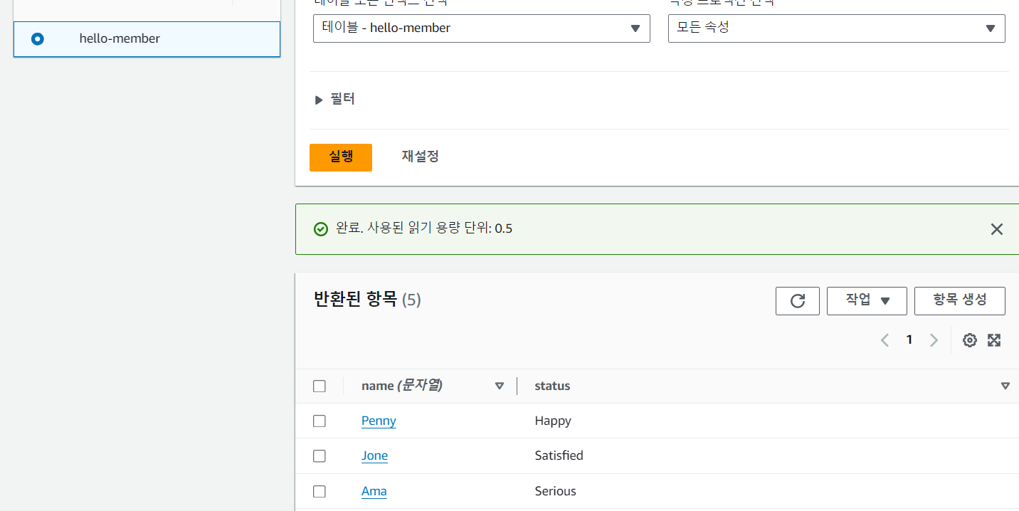 DynamoDB > 표 항목 탐색에서 who are you 버튼을 클릭해 표시된 값이 모두 저장되는 것 역시 확인할 수 있습니다.