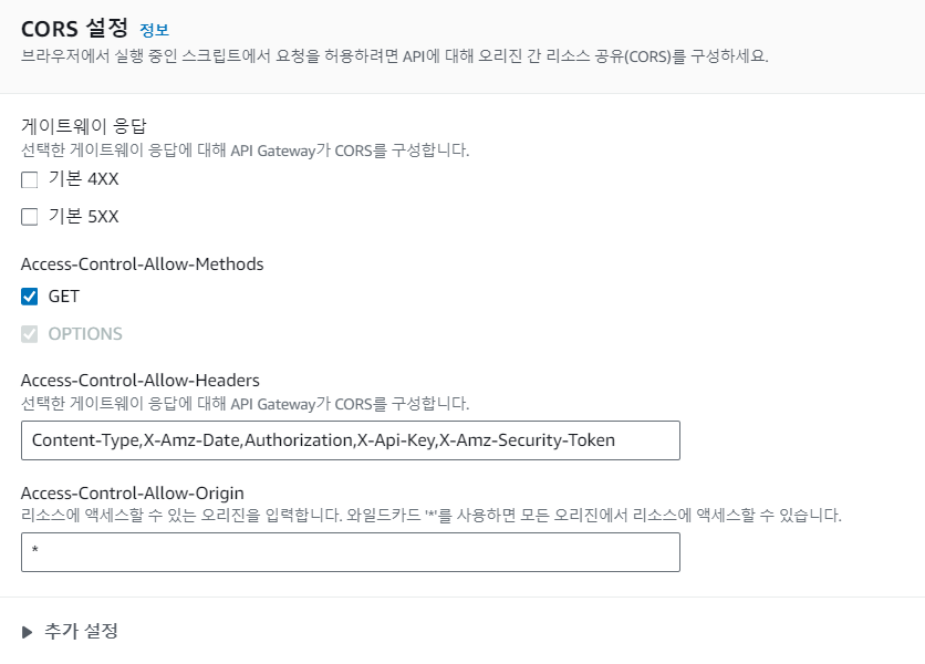 API 메뉴로 돌아와 CORS 활성화를 클릭, GET 체크 후 저장합니다.