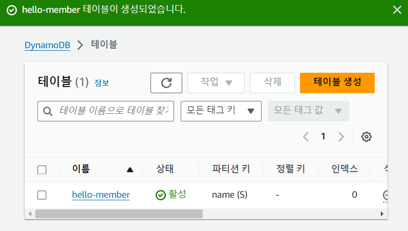 DynamoDB로 들어가 테이블 생성을 클릭합니다.