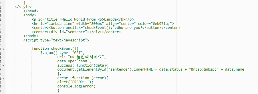이제 Lambda > simple-webpage > 소스 코드 내 "URL을입력하세요" 를 지운 후