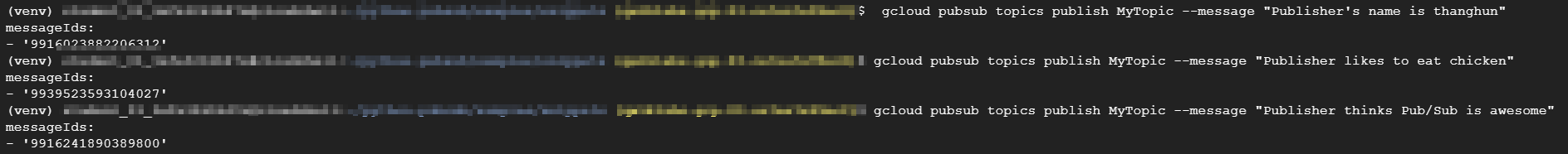 gcloud pubsub topics publish MyTopic --message "Publisher's name is thanghun"
