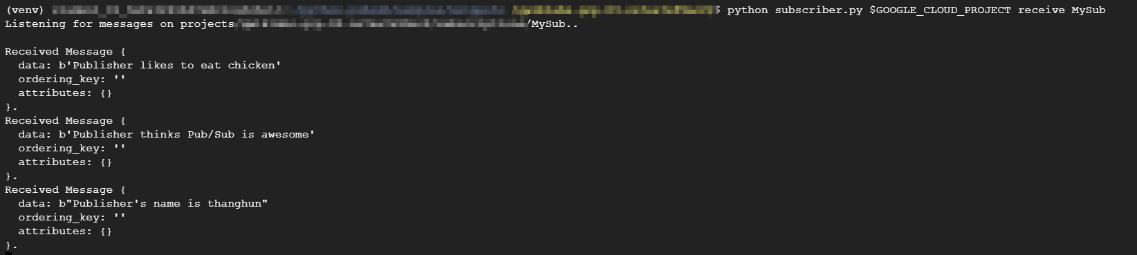 python subscriber.py $GOOGLE_CLOUD_PROJECT receive MySub