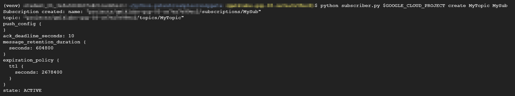 python subscriber.py $GOOGLE_CLOUD_PROJECT create MyTopic MySub