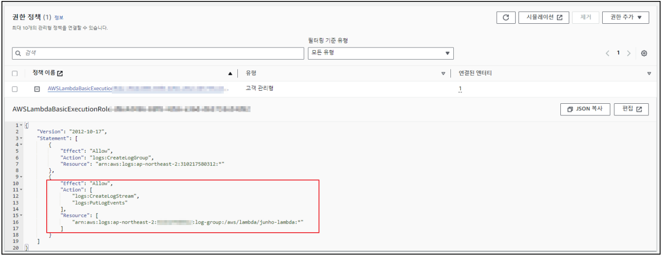 - 동일한 방식으로 람다 함수 실행으로 만들어질 로그그룹 및 로그 스트림에 대한 권한을 얻기 위해 아래의 정책 추가