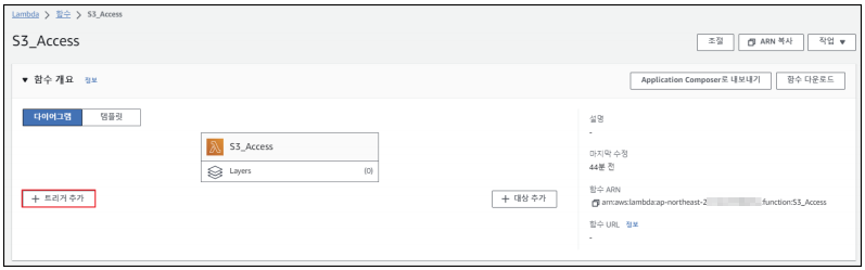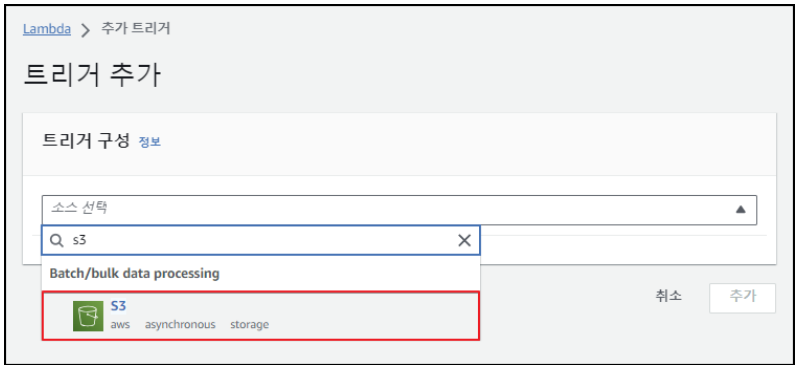 - 트리거 추가시 소스를 S3로 선택 후 객체 생성 시 트리거 작동으로 람다 함수 실행