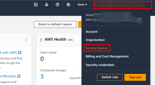 먼저 콘솔에 접근하여 우측 상단의 user name을 클릭하면 아래의 사진과 같이 service quota를 확인할 수 있습니다.