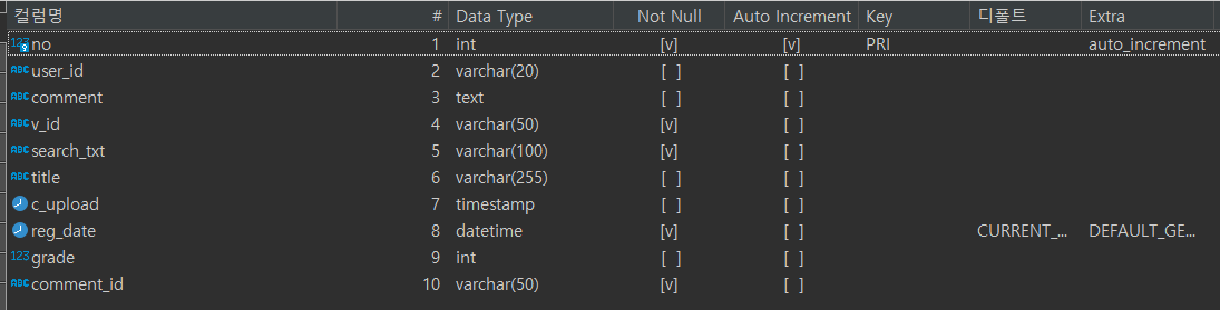 comment_list : 동영상 댓글 저장 테이블