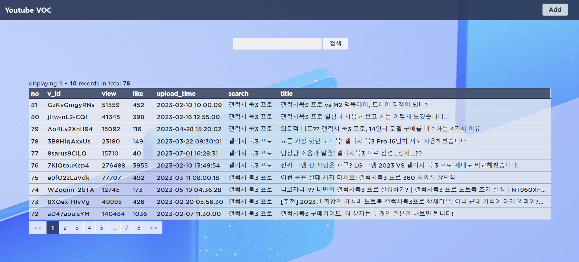 DB에 저장되어 있는 동영상의 정보를 볼 수 있고 Pagenation으로 데이터 가독성을 높이고 검색어 기준으로 상단의 검색창을 통해 검색할 수 있습니다.