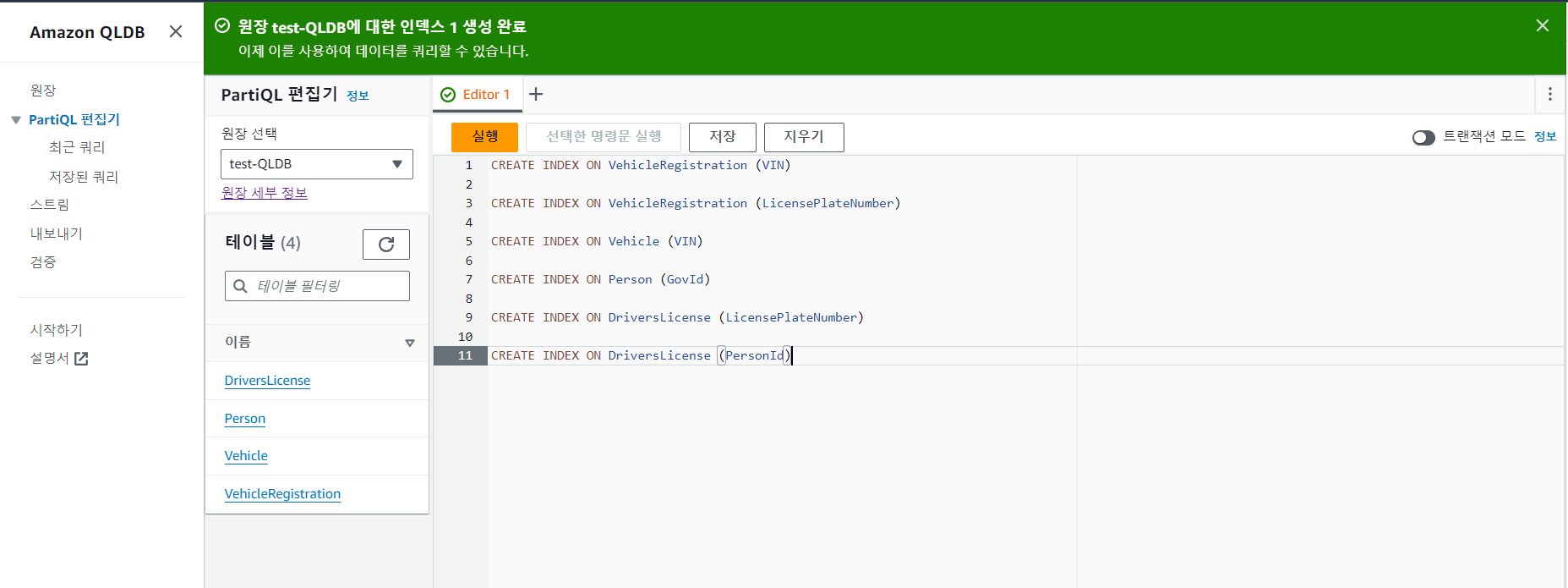 PartiQL 편집기 이동후 CREATE 문을 사용하여 인덱싱 생성