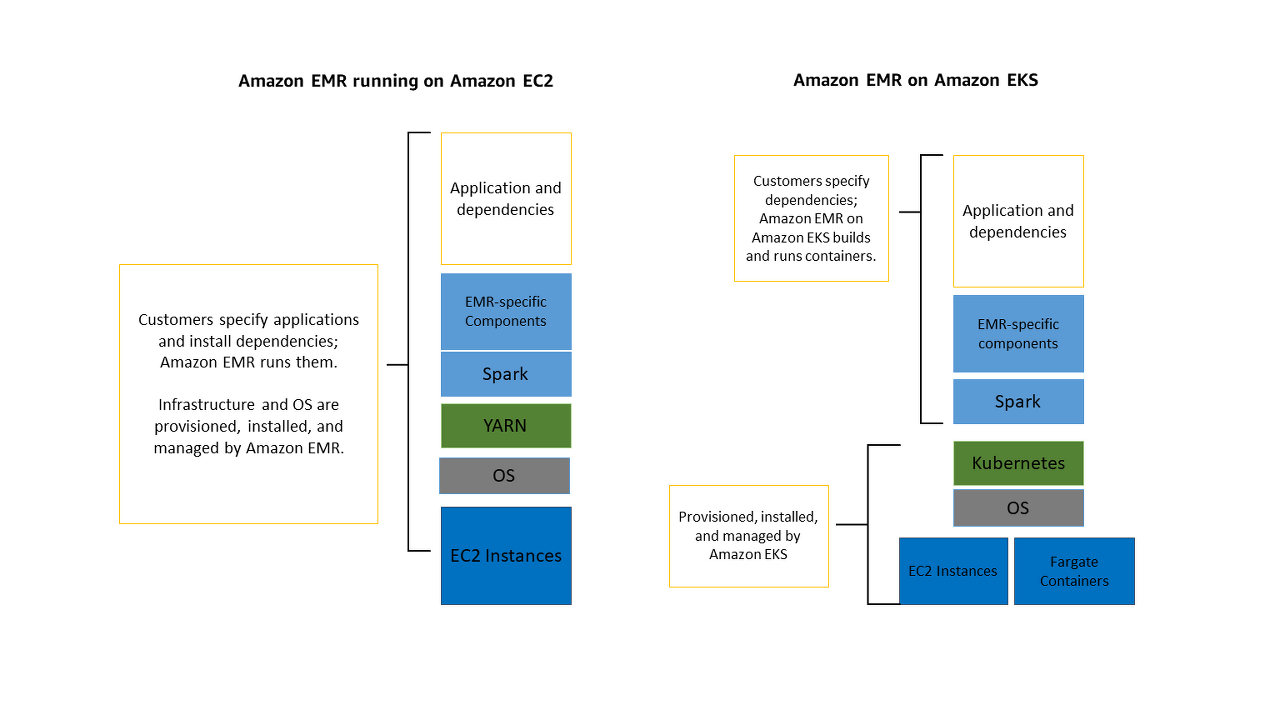 EKS 기반 Amazon EMR은 Amazon EKS (Amazon Elastic Kubernetes Service) 에서 오픈 소스 빅 데이터 프레임워크를 실행할 수 있는 Amazon EMR용 배포 옵션을 제공합니다. 이 배포 옵션을 사용하면 EKS 기반 Amazon EMR이 오픈 소스 애플리케이션용 컨테이너를 구축, 구성 및 관리하는 동안 분석 워크로드를 실행하는 데 집중할 수 있습니다.
