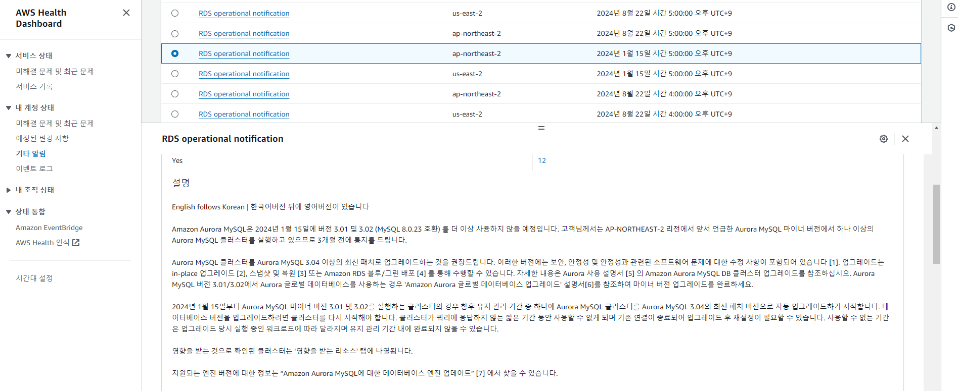 최근 고객사의 인프라를 점검하던 도중 AWS에서 Maintenance, 서비스 업데이트 등의 알림등을 알려주는 AWS HealthBoard에서 RDS의 AuroraMysql 엔진버전 업그레이드 알림을 받은것을 확인 하였는데요