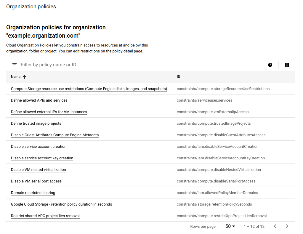 - Organization Policy를 편집하려는 프로젝트, 폴더 또는 조직을 선택합니다. Organization Policy 페이지에는 사용 가능한 조직 정책 제약조건 목록이 표시됩니다.