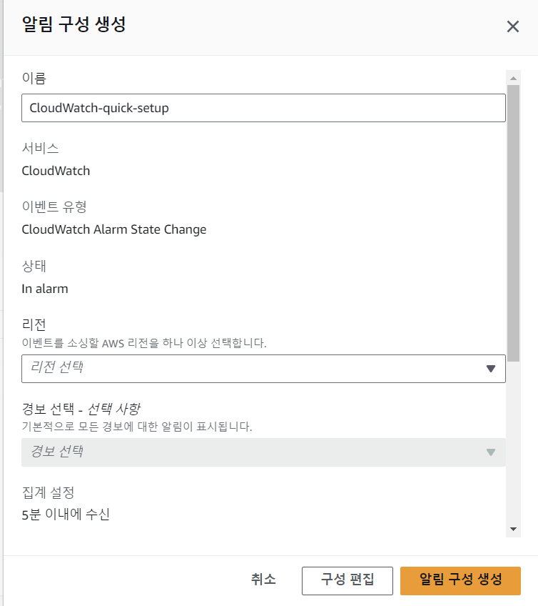 예를들면 아래와 같이 CloudWatch의 quick 알림의 경우