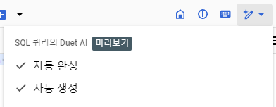 만약 해당 기능을 신청을 통해 활성화 하셨다면 SQL 쿼리의 Duet AI 설정을 통해 활성화 하실 수 있습니다!!