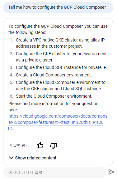 이 기능은 GCP의 기능이나 사용 방법에대해 편하게 물어볼 수 있는 AI 대화창입니다!!