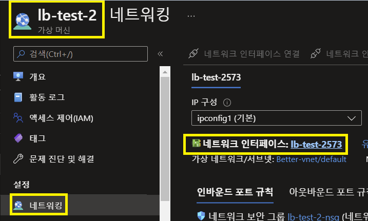 다음과 같이 VM의 네트워킹탭에 네트워크 인터페이스를 클릭합니다.