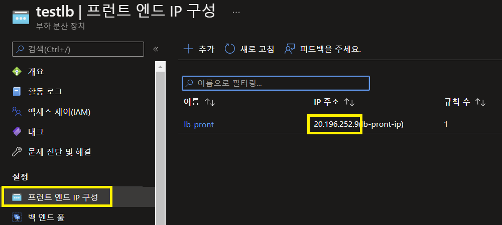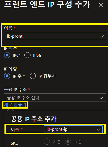 프런트 엔드 IP 구성 추가 버튼을 누르게 되면다음과 같은 창이 나오게 되는데, 여기서 이름과 공용 IP주소를 설정해줍니다.