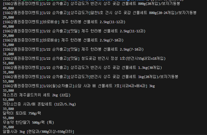 해당 리스트를 for문을 이용하여 안의 텍스트만 출력 해보면 원하는 값들이 출력되는것을 볼 수 있습니다.