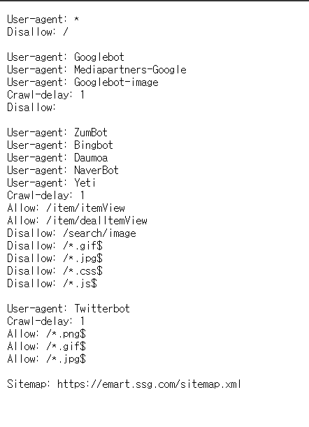 이마트 사이트의 robots.txt 파일의 내용에 agent는 yeti를 사용하는 것을 허용 한다고 적혀 있기 때문에