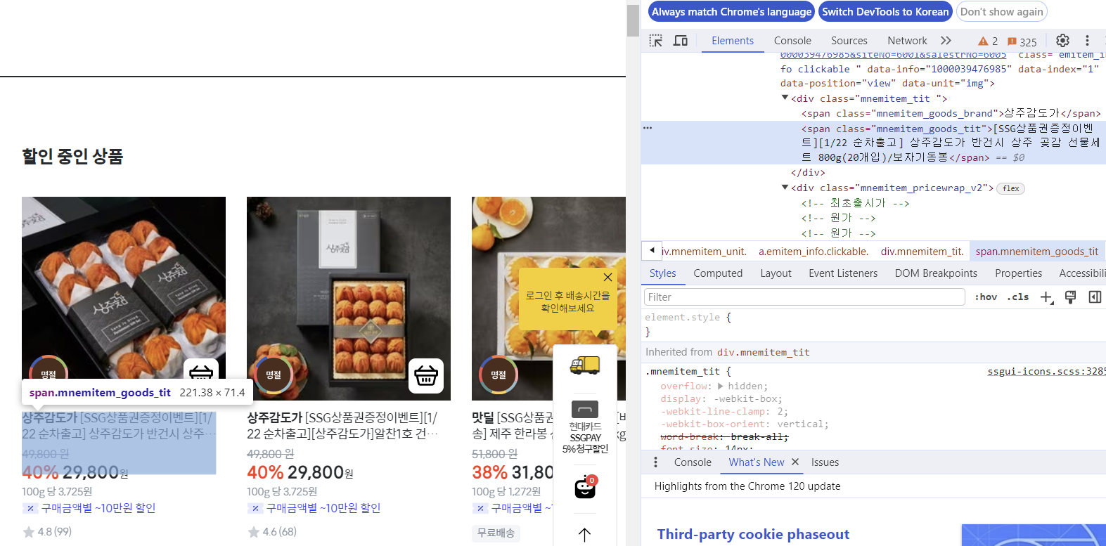 개발자 모드(f12)를 이용해 원하는 정보의 선택자를 찾고
