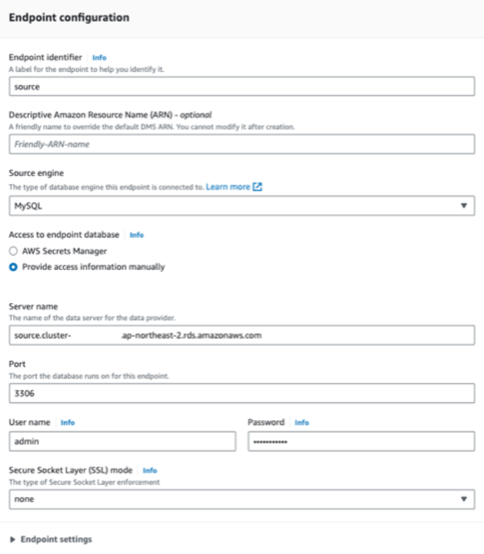 - Access to endpoint database : 별도로 Secret Manager 를 사용하는 경우가 아니라면 Provide access information manually 를 선택해서 수동 입력