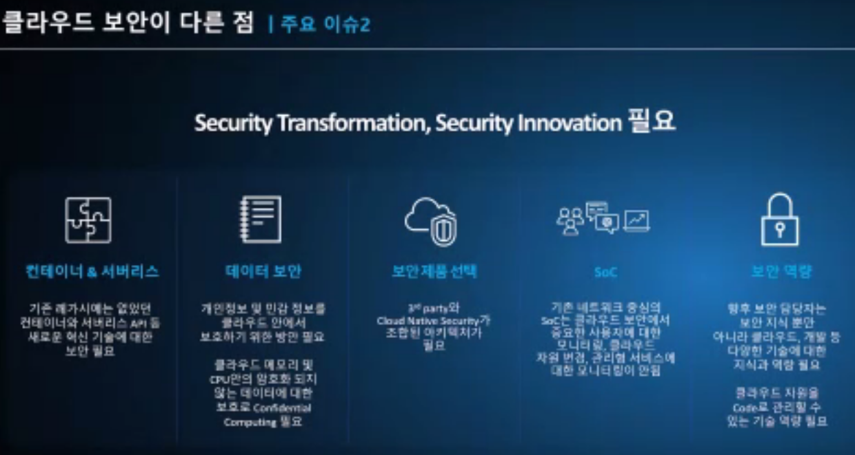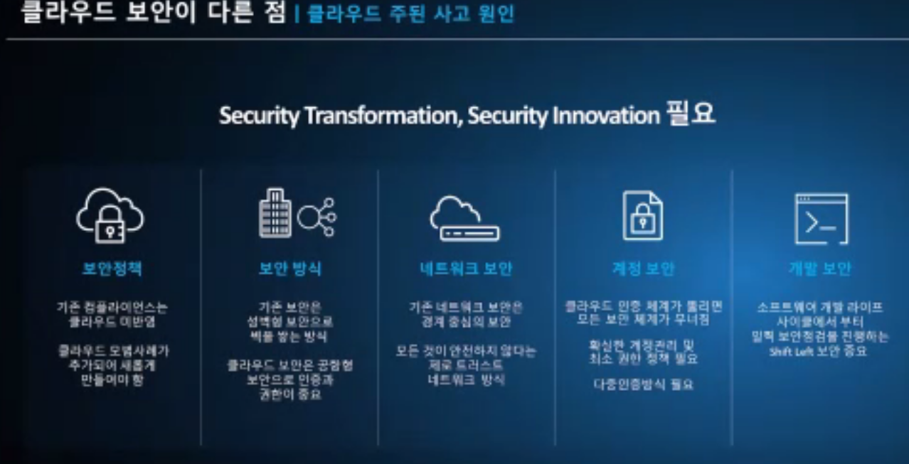 클라우드에서 보안은 일반적인 레거시 IT 환경과 다르게, 아래와 같이 다양한 부분에서 파악해야할 보안 고려사항들이 있습니다. 또한 대부분의 클라우드 보안 사고 원인은 사용자의 실수로 인한 휴먼 에러로 발생하게 됩니다.