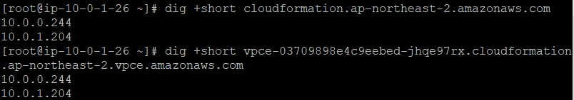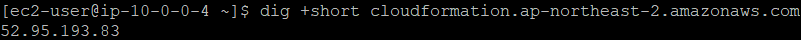 EC2 인스턴스에 접근하여 서울 리전에 있는 CloudFormation 서비스의 DNS 주소와 매핑 해보면, 최초 통신과 다르게 프라이빗 IP 대역으로 되어 있는 걸 볼 수 있습니다. 해당 IP 주소는 인터페이스 엔드포인트의 주소입니다.