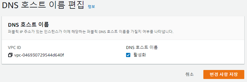 -> 생성한 VPC에서 DNS 호스트 이름을 편집해 주겠습니다.