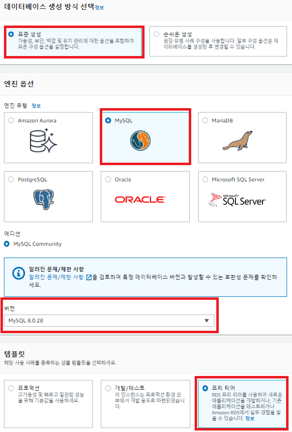 B. 표준생성 -> MySQL -> 버전선택 -> 프리티어선택