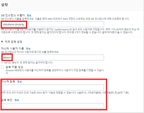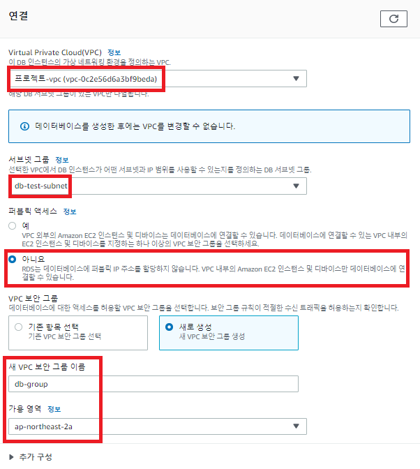 E. 만든VPC선택 -> 만든 서브넷 선택 -> 퍼블릭엑세스 아니요 선택 -> 보안그룹 생성 -> 생성