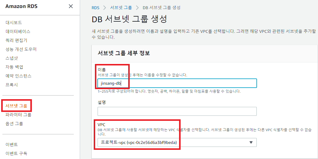A. RDS -> 서브넷그룹 -> 이름입력 -> 설명입력 -> 만든 VPC 선택