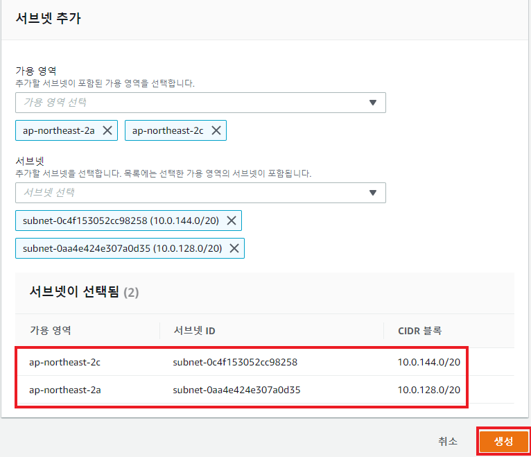 B. 저번에 만들었던 a존과 c존에 위치한 프라이빗 서브넷2개 선택 -> 생성