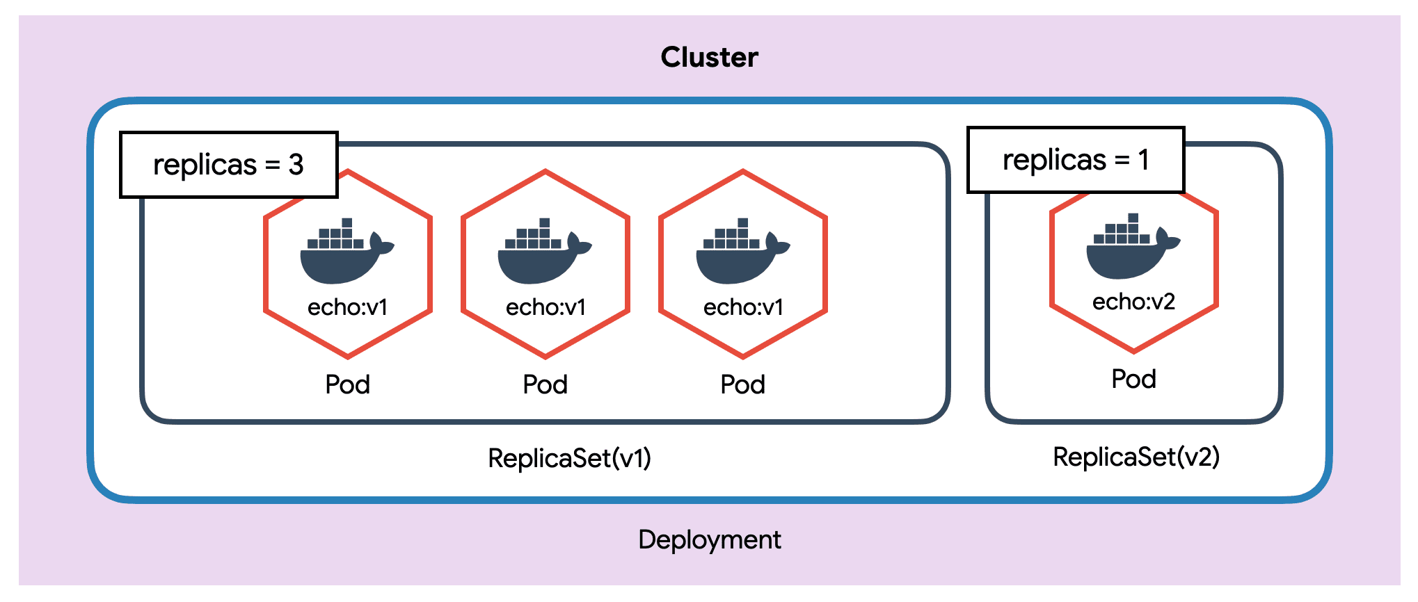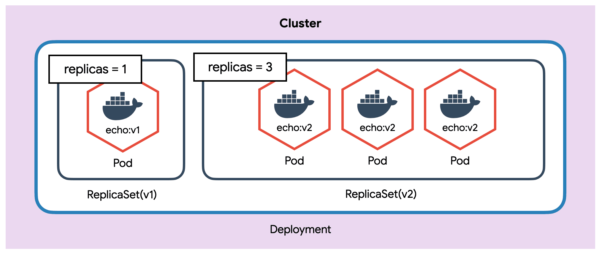 Deployment는 새로운 이미지로 업데이트하기 위해 ReplicaSet을 이용합니다. 버전을 업데이트하면 새로운 ReplicaSet을 생성하고 해당 ReplicaSet이 새로운 버전의 Pod을 생성합니다.