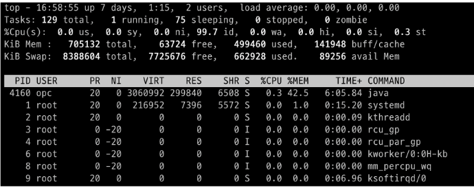 top 명령어는 현재 OS의 상태를 나타내주는 CLI 어플리케이션입니다. 메모리 사용량, CPU 사용량 등을 나타내주며 top를 실행하는 동안에는 주기적인 업데이트로 실시간에 근접한 내용을 보여줍니다. 리눅스에서 top 명령어를 실행하면 아래와 깉이 노출됩니다. 위에는 전체의 요약이 있으며 아래에는 각 프로세스마다 구체적인 내용을 포함하고 있습니다.
