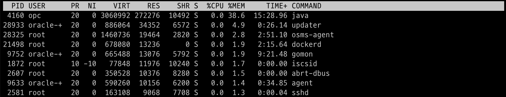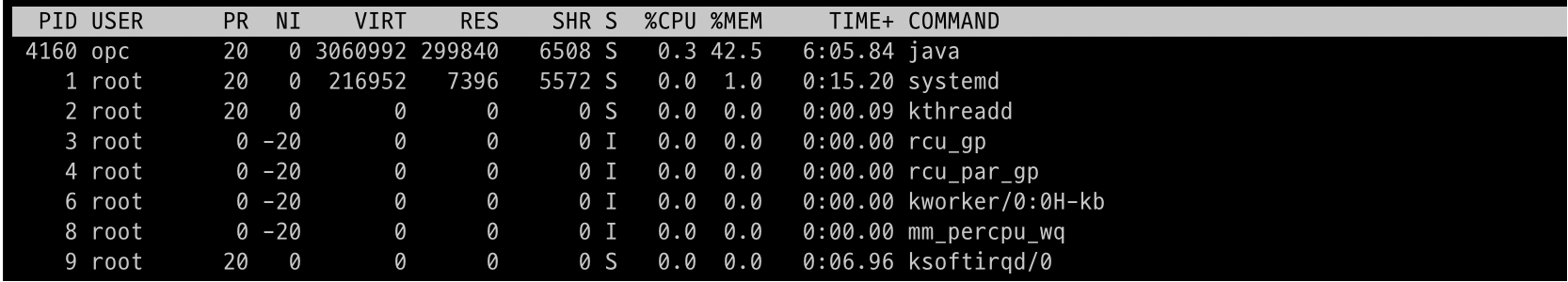 top 명령어의 디테일 영역에 대해서 알아보도록 하겠습니다. 디테일 영역에는 각 프로세스에 대한 상세한 내용이 나옵니다. 위 예제에서는 아래의 이미지 부분이 디테일 부분입니다. 각 요소에 대해서 하나씩 보도록하겠습니다.